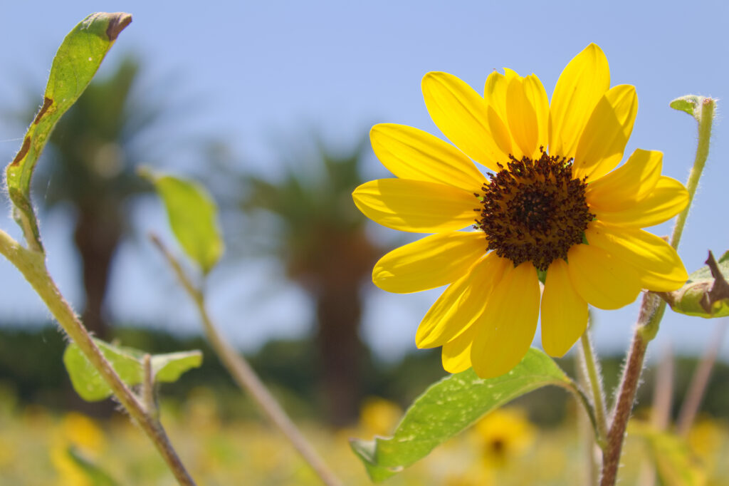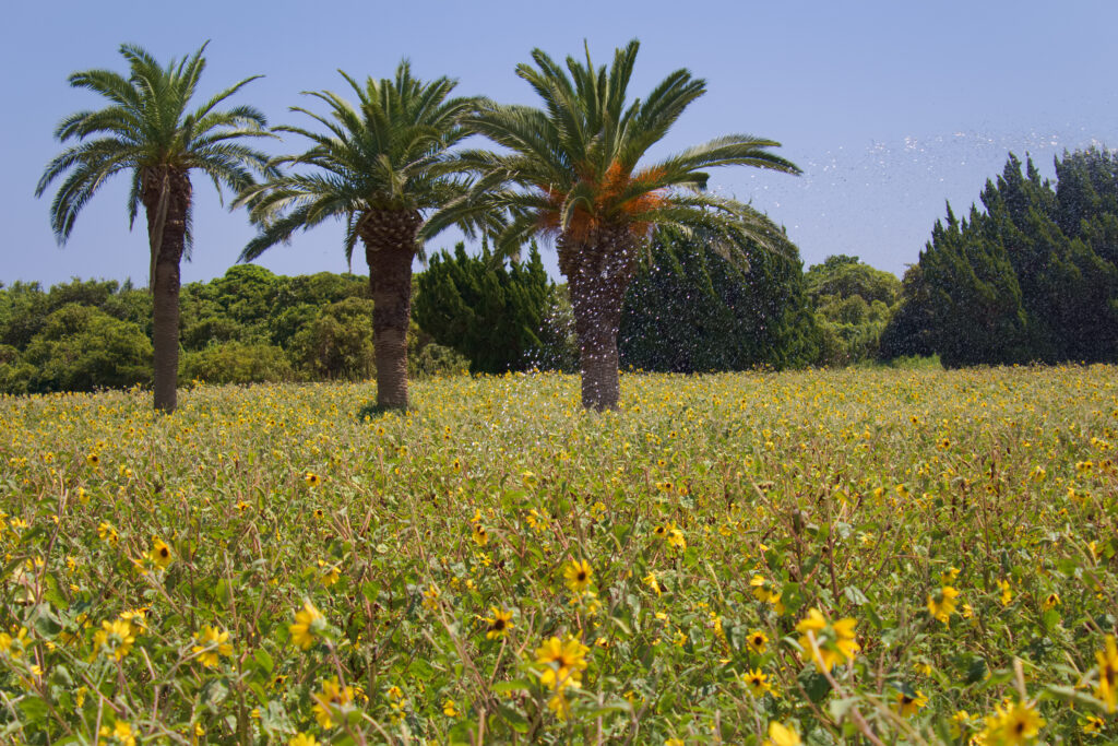 駐車場に車を停めていざ菜の花ガーデン内へ。一歩足を踏み出すと、そこは視界いっぱいに溢れんばかりの黄色の花畑。椰子の木も加わり、温暖な南国にいるような感じ。
