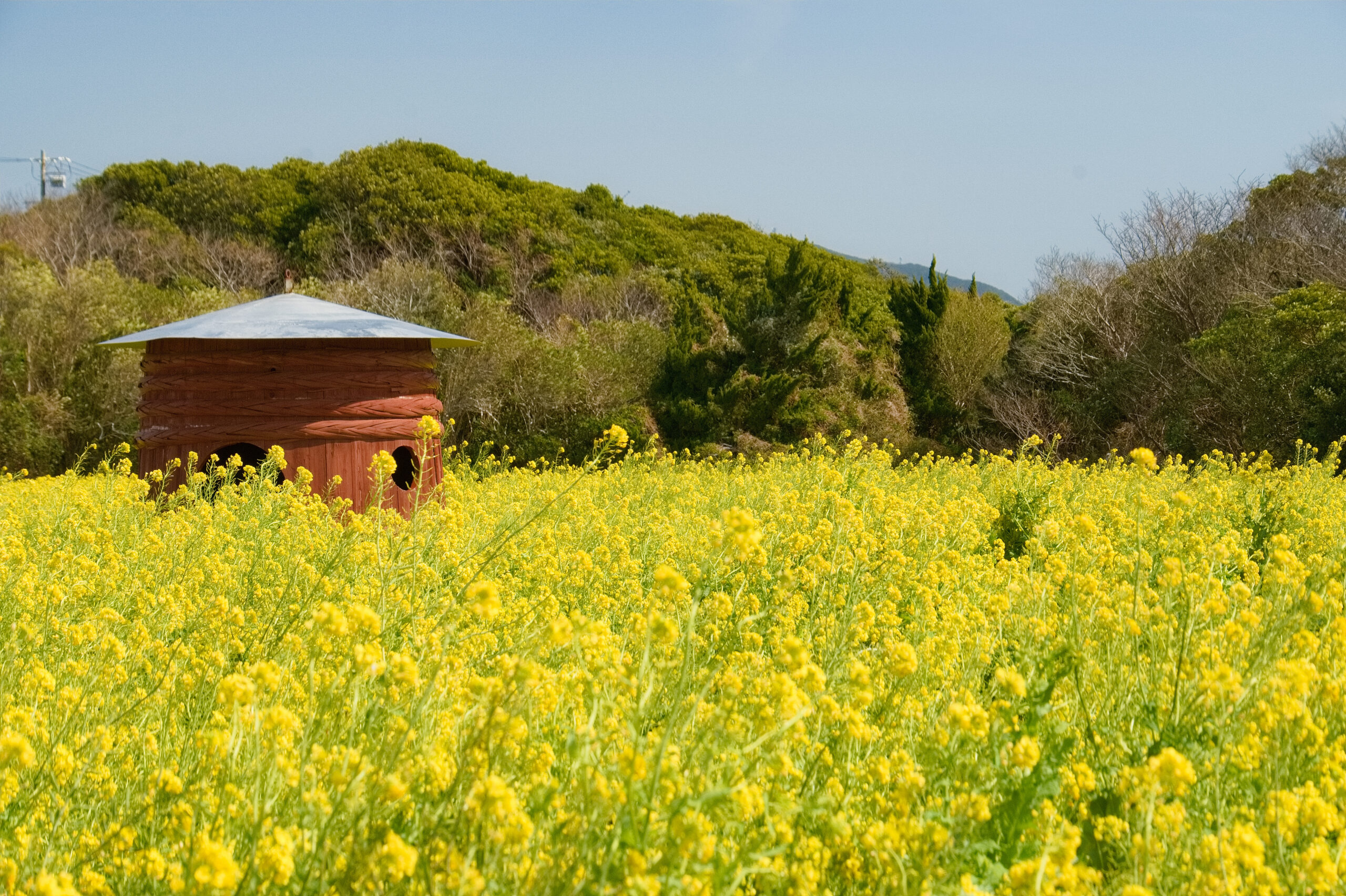 包み込んでいるのは訪れている人だけではない。ぽつんと佇む小屋は菜の花に囲まれていると、まるで絵本の世界みたいに映る。