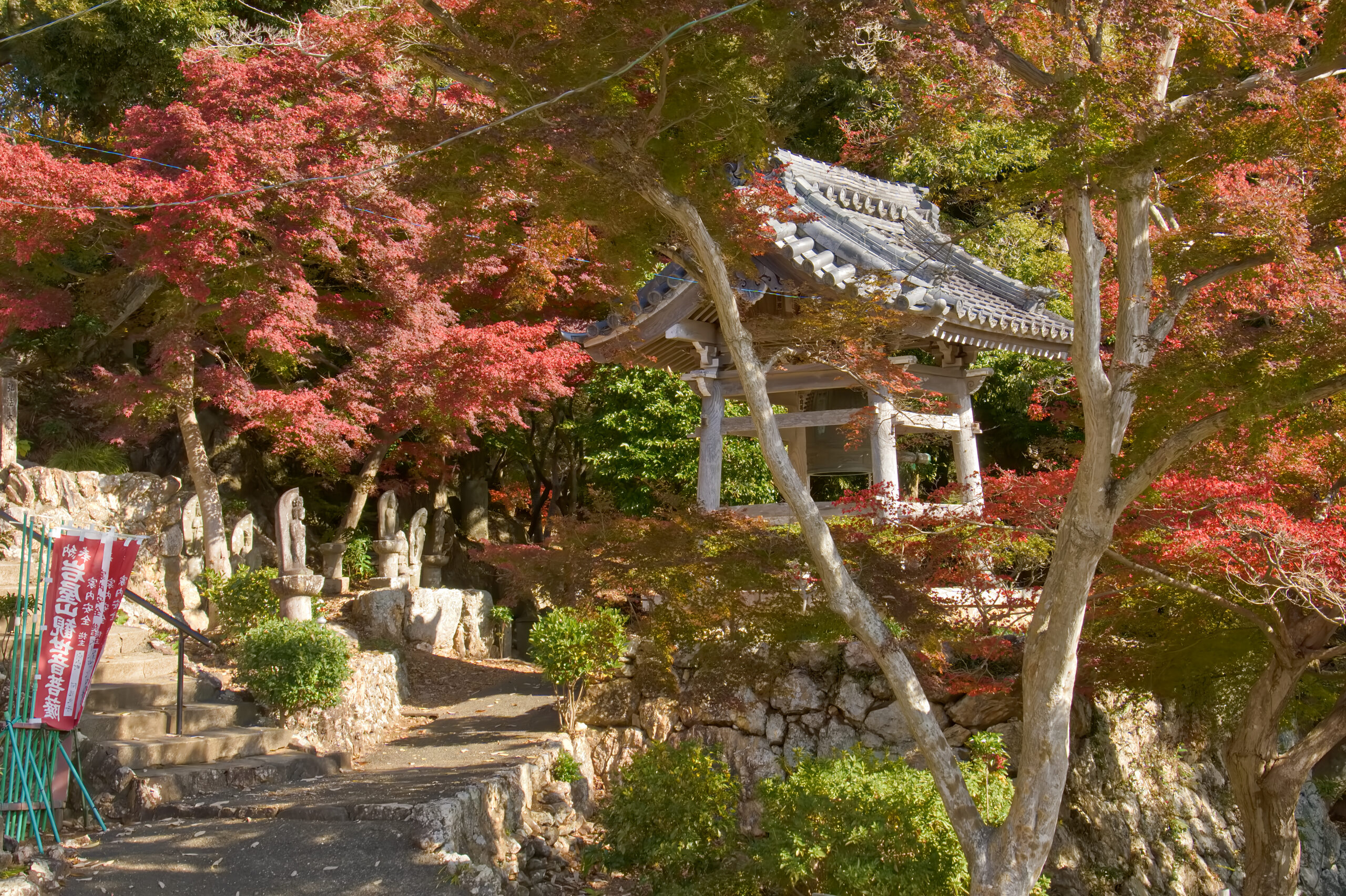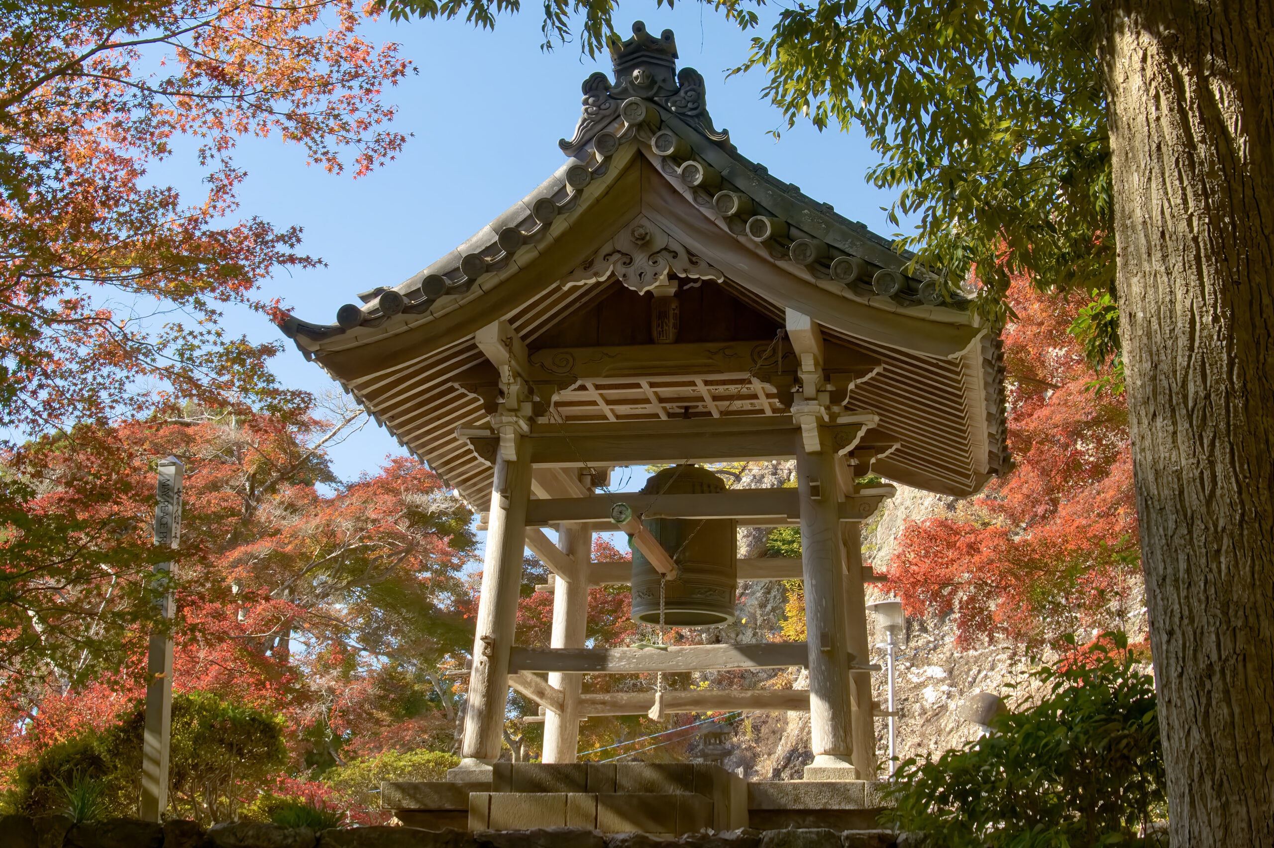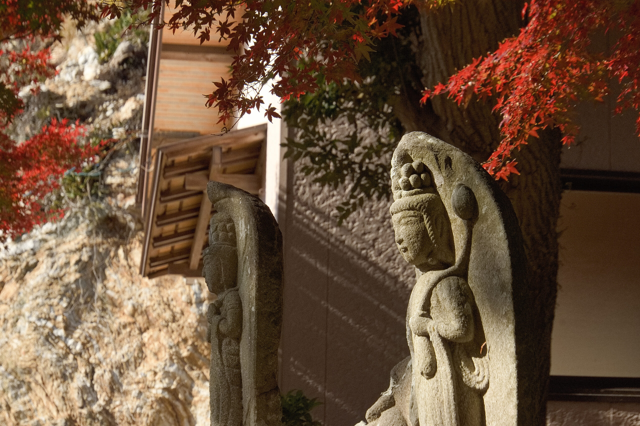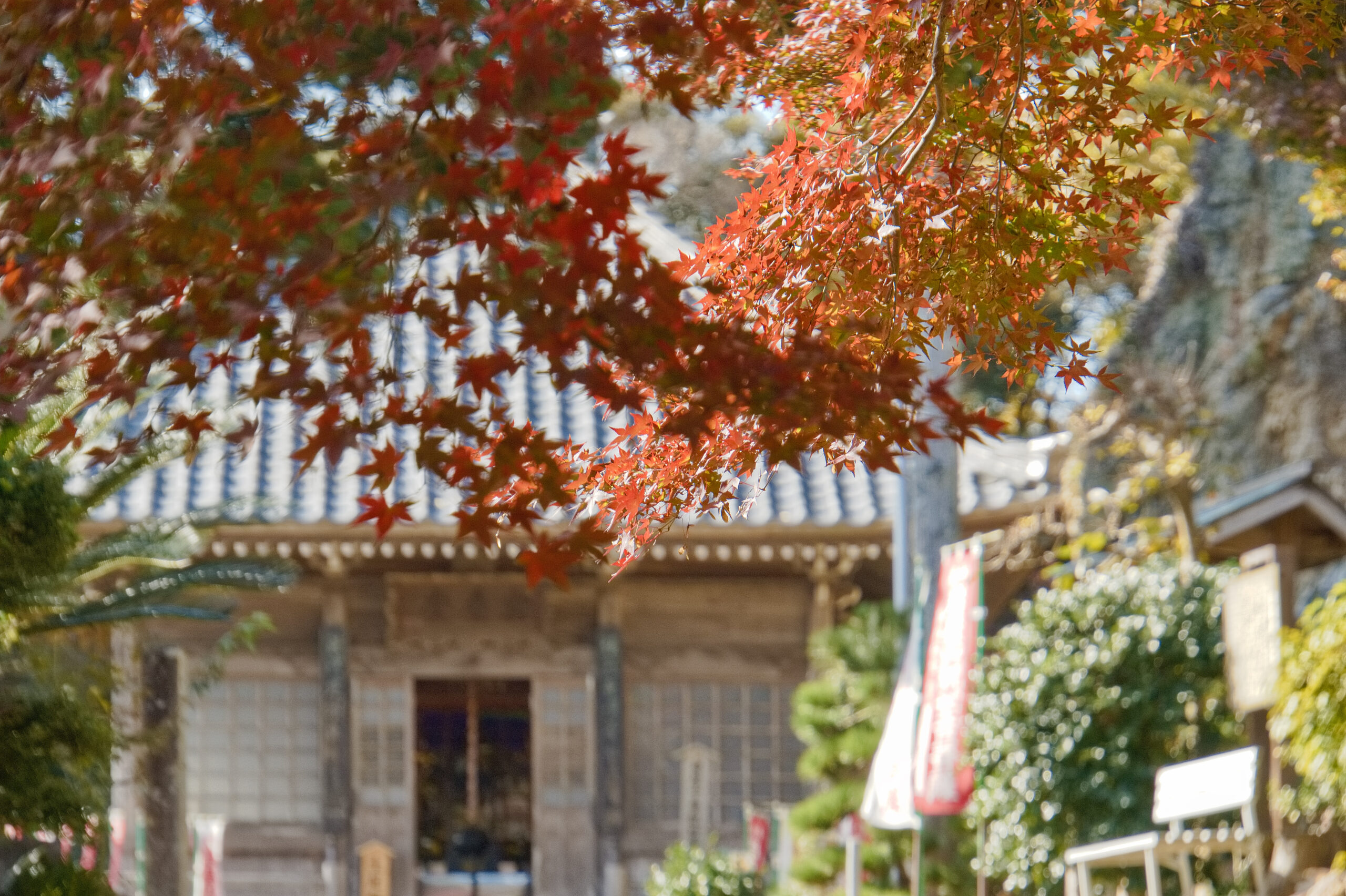 岩屋観音堂と紅葉。観音堂の戸は開けられており、近くに行くとお線香が匂いが漂っている。