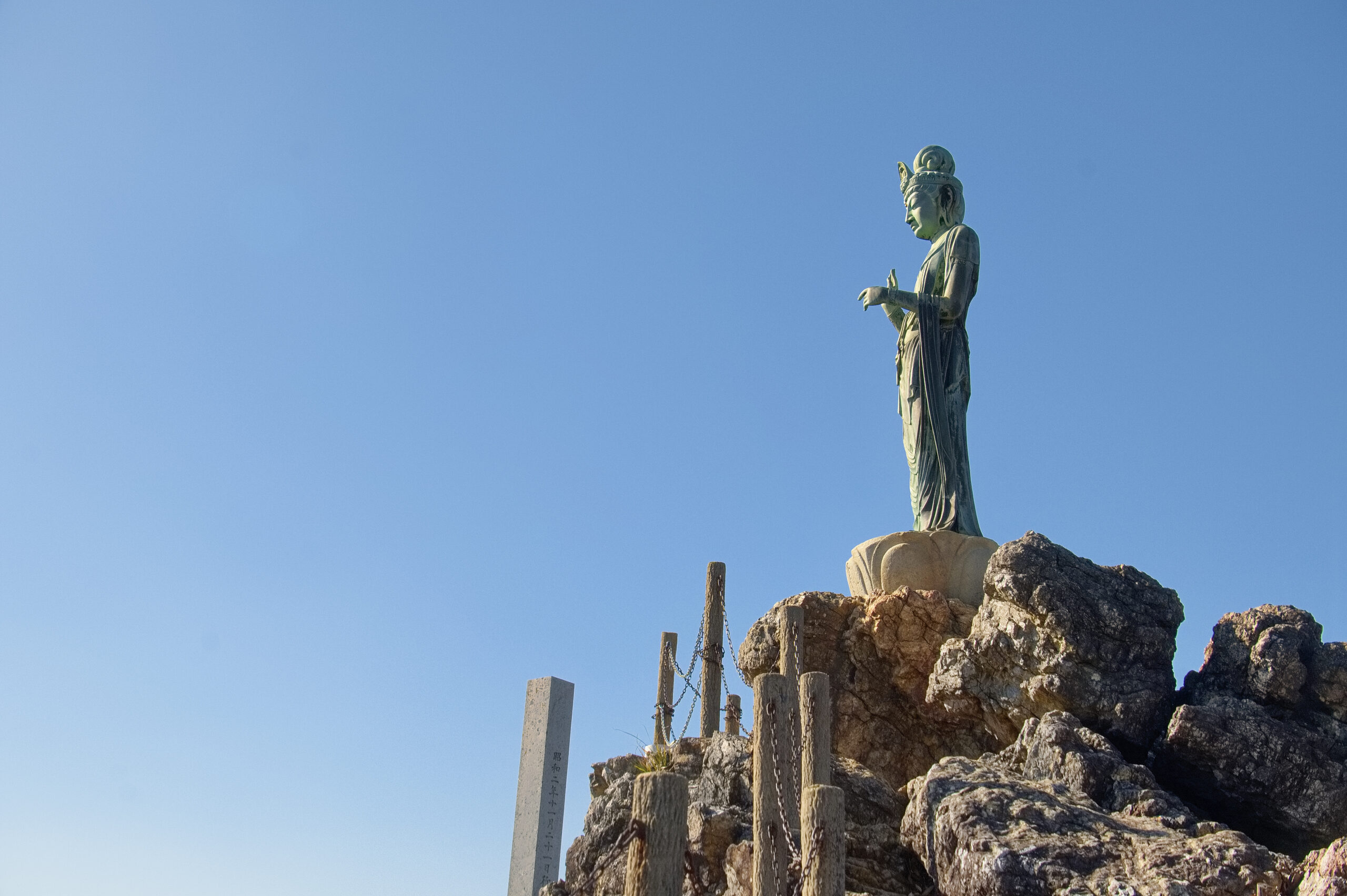 日中の観音像を撮影したが、朝日であったり、日没であったり、はたまた雲がかった天候で撮影できたのならまた違った雰囲気の観音像となるだろう。