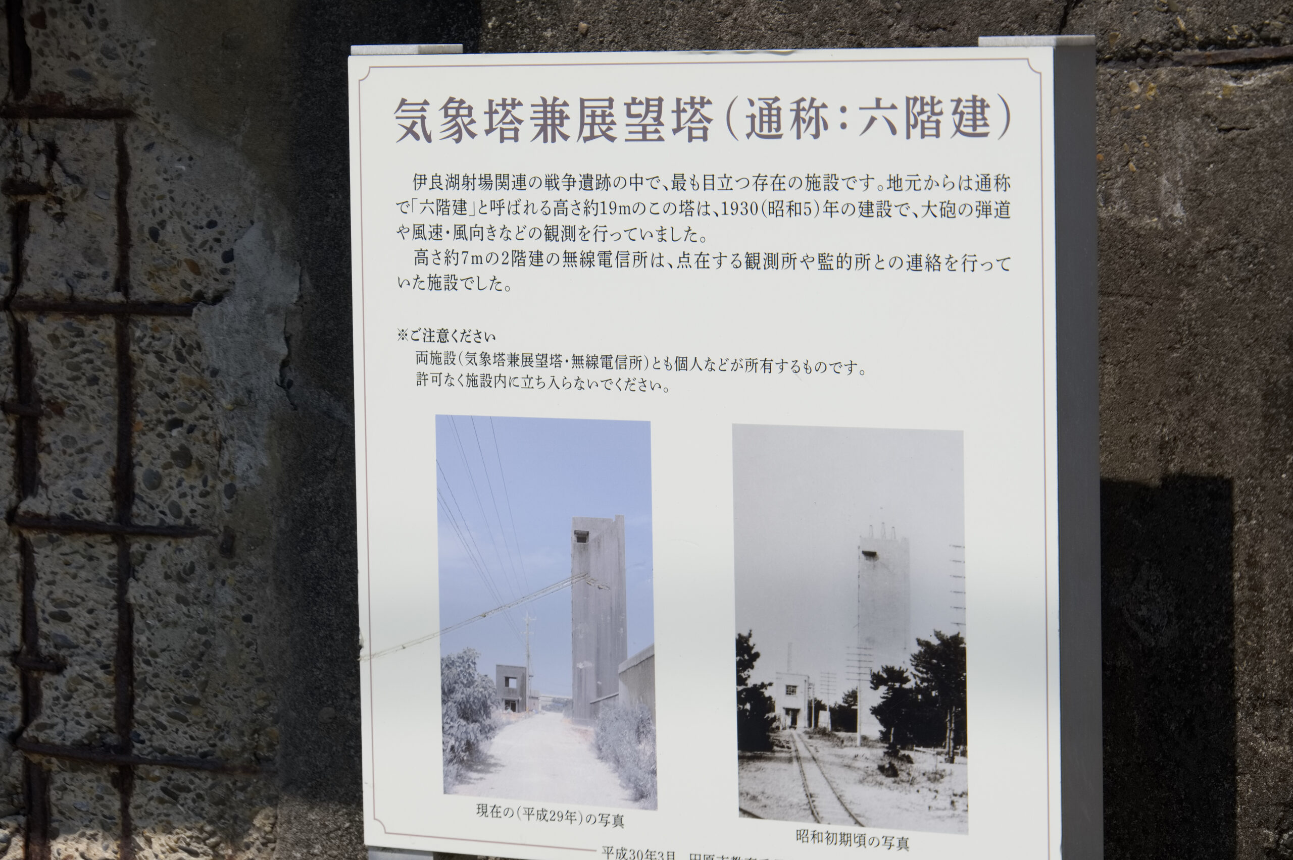 六階建の傍には説明書きがされている看板がある。高さ19mもあり、射場から放たれた砲弾の弾道や風速・風向きなどの観測を行っていたとされる。同時に名前の通り、気象観測もされていたようだ。