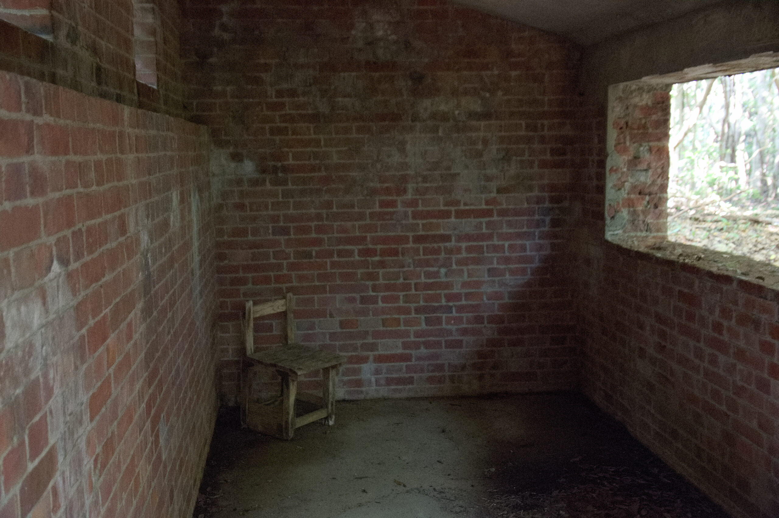 中には木製の椅子が隅にぽつんと置かれているのみ。木陰で日の光があまり入らずなんとも哀愁が漂う雰囲気となっている。