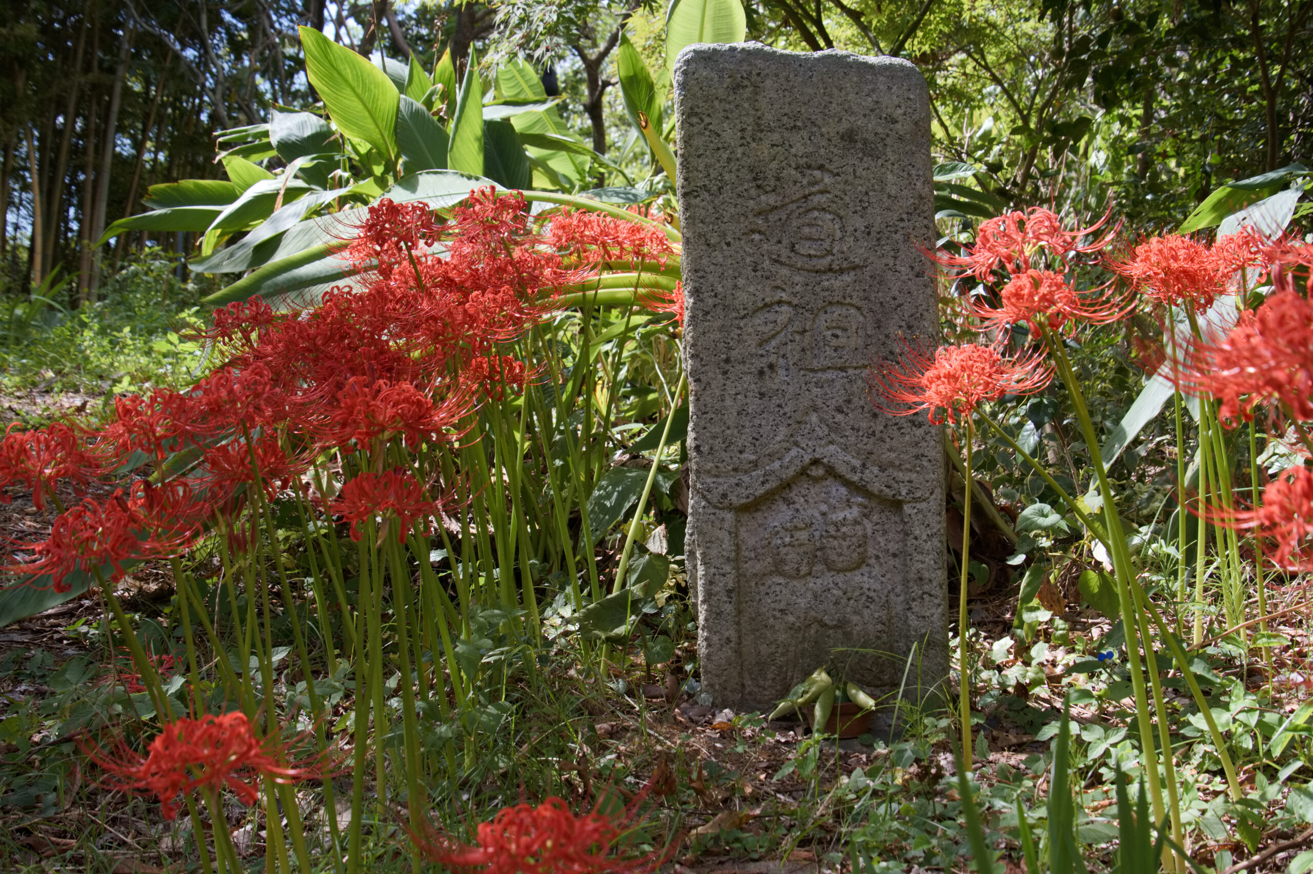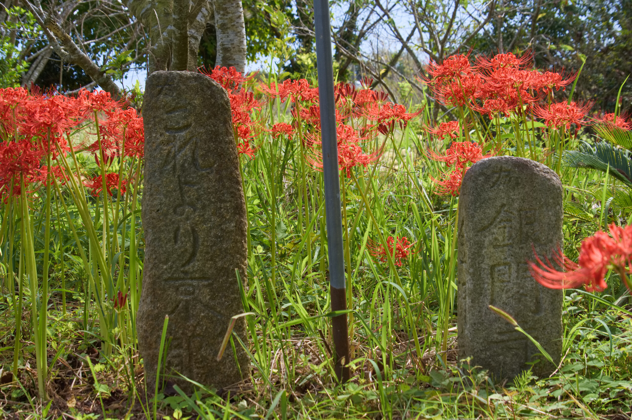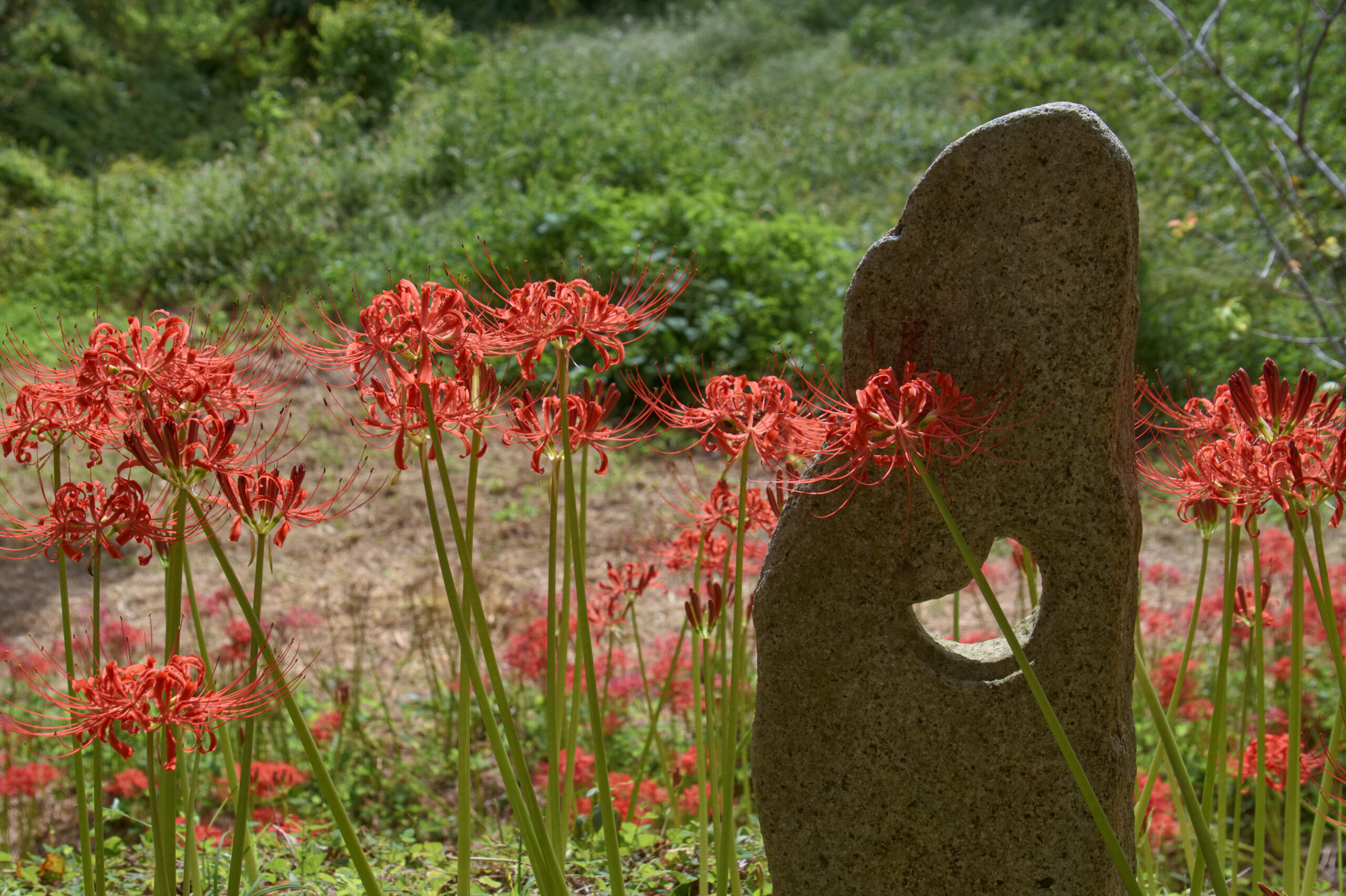 彼岸花のととに様々な石碑や石で出来たオブジェクトがある。彼岸花と合わせて見てみるのも面白い。