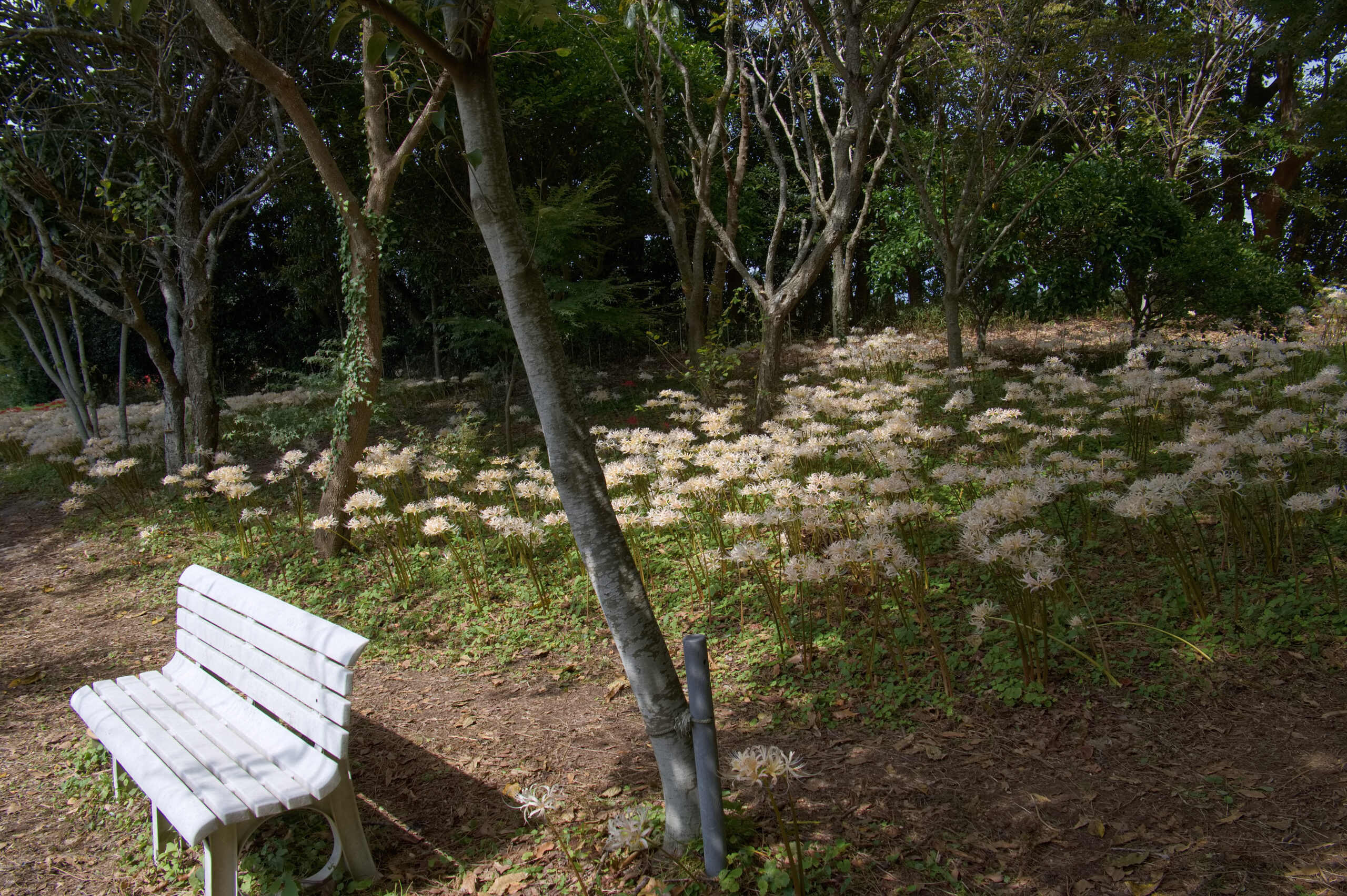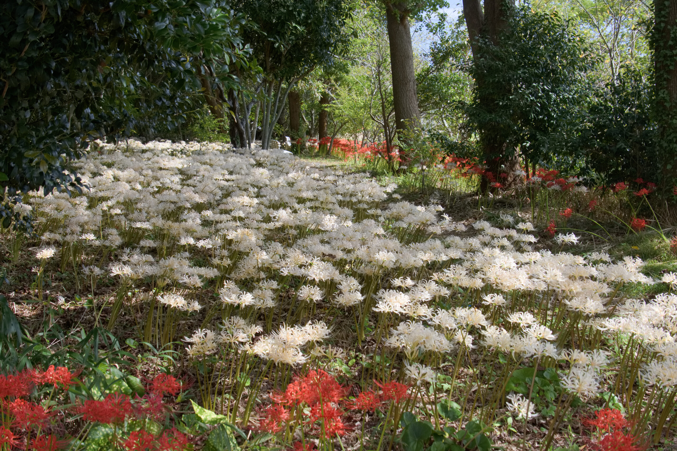 林の中には白色の彼岸花が群生されている。白花曼珠沙華と呼ばれおり、赤い彼岸花と黄色の彼岸花の自然交配で出来ているようだ。