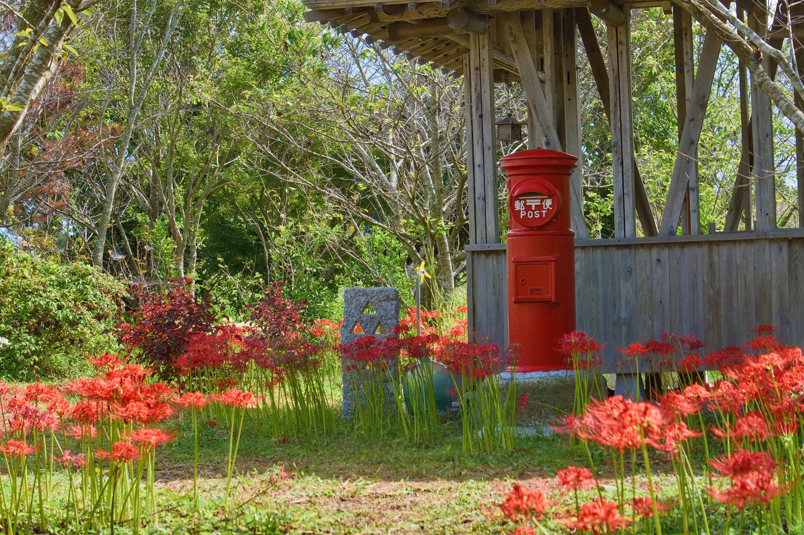 休憩所とポストと彼岸花。その傍にお地蔵様がある。
