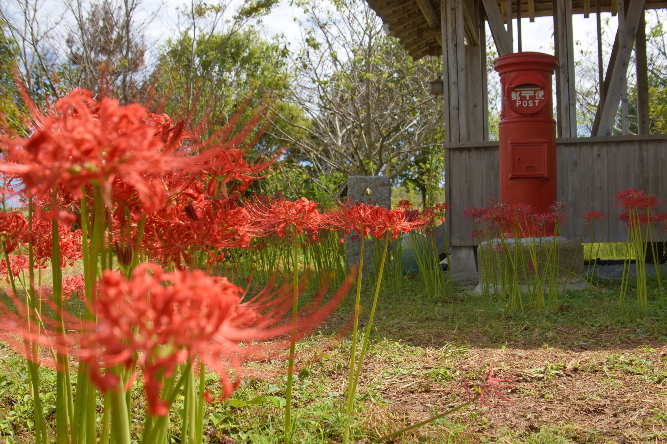 休憩所とポストと彼岸花。その傍にお地蔵様がある。